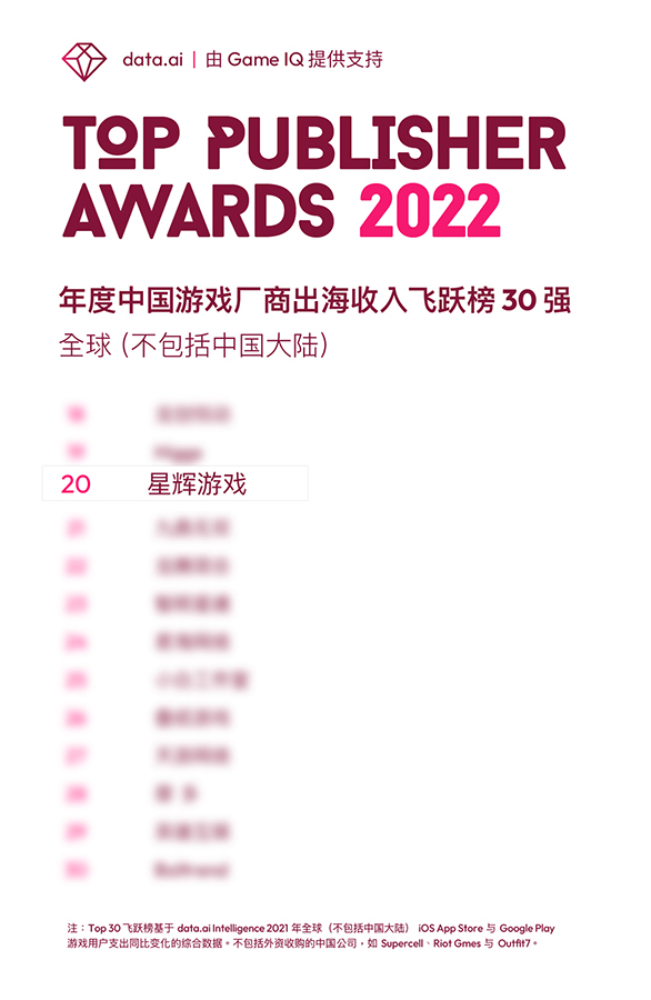 Recently, data.ai, a renowned third-party data agency, released the "2022 Level Up Top 30 Chinese game companies in terms of overseas revenue growth". With its outstanding overseas revenue growth, Rastar ranked 20th on the list.