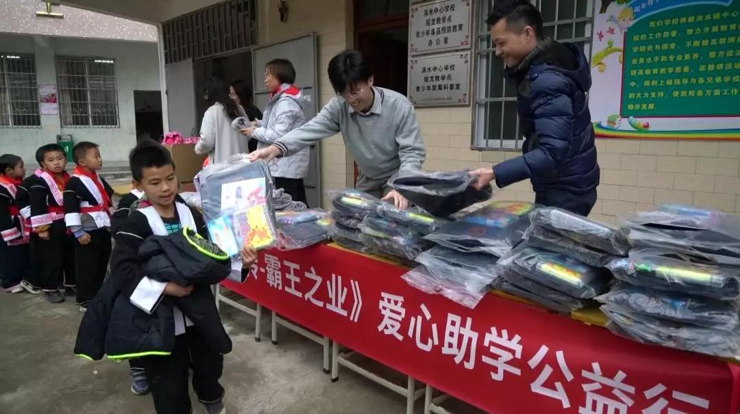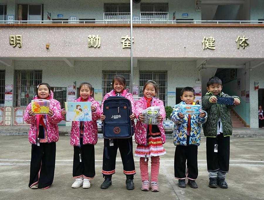 腾博会以诚信为本游戏代表为瑶龙小学孩子们赠送书包、文具等学习用品