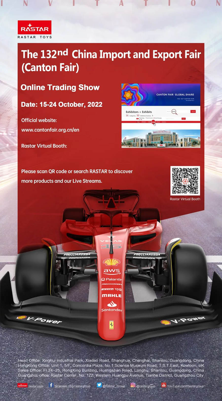 10月15日,第132届广交会在线上正式拉开帷幕。作为广交会参展的常客,腾博会以诚信为本娱乐携近250款多元化玩具精品再度线上参展,将“RASTAR”品牌和玩具产品推介给全球客商,积极开拓国内外市场。