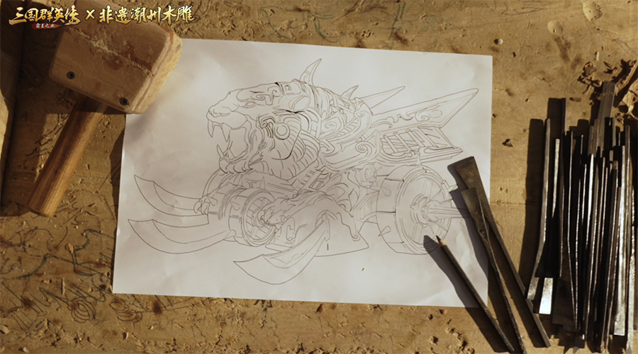 陈培臣先生以游戏中的虎战车为原型,亲自用金漆木雕工艺还原这个三国历史上的传奇兵器。在一笔一划、一刀一刻之间,威猛霸气的虎战车初现雏形,再经过精修、打磨、上漆,一辆雕刻精细、形神兼备的虎战车最终呈现,正如前人所总结的 “杂杂、匀匀、通通”潮州木雕六字特色一般,达到“细而不腻、大而不空、繁而不乱、艳而不俗”。